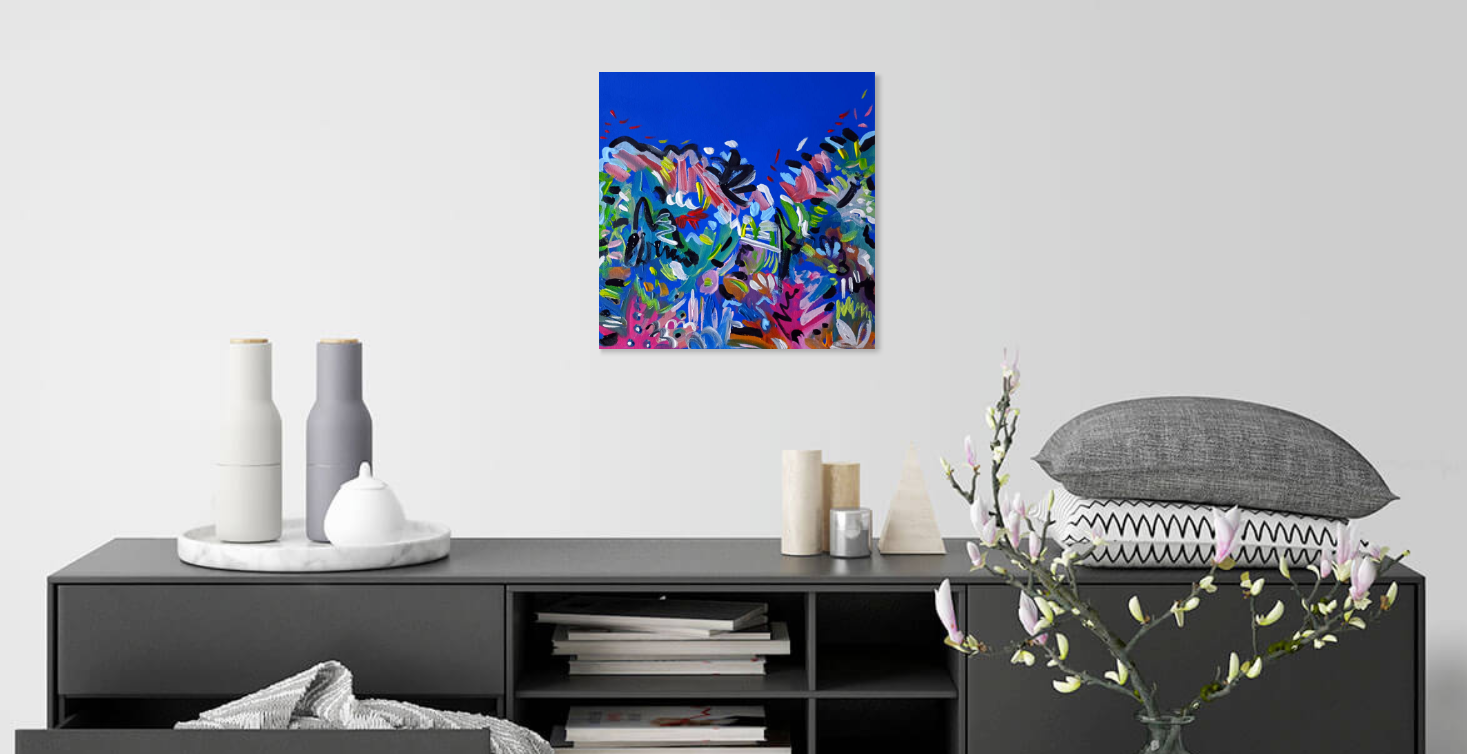 Offrez-vous ce tableau unique réalisé à la peinture vinylique sur un châssis en coton.   Les couleurs sont vives et un vernis rend le tableau très brillant. Le fond du tableau est réalisé avec une peinture bleu Klein très lumineuse.