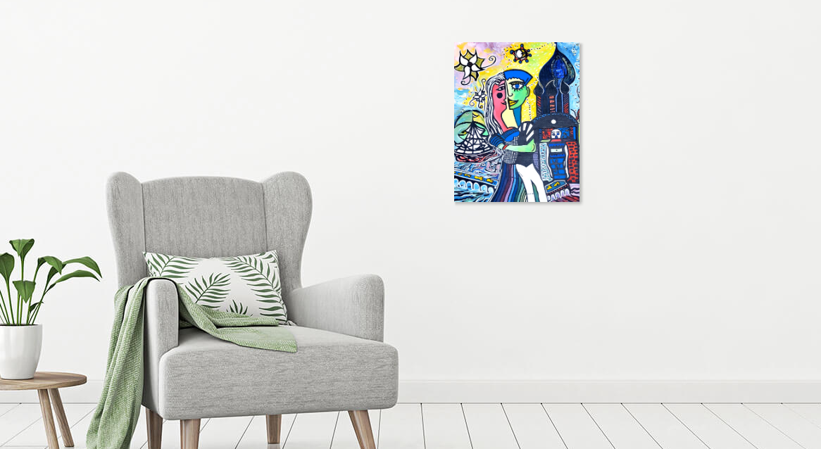 Offrez-vous ce tableau unique réalisé à la peinture acrylique sur un châssis en lin de grande qualité. Les couleurs sont vives et un vernis rend le tableau très brillant.