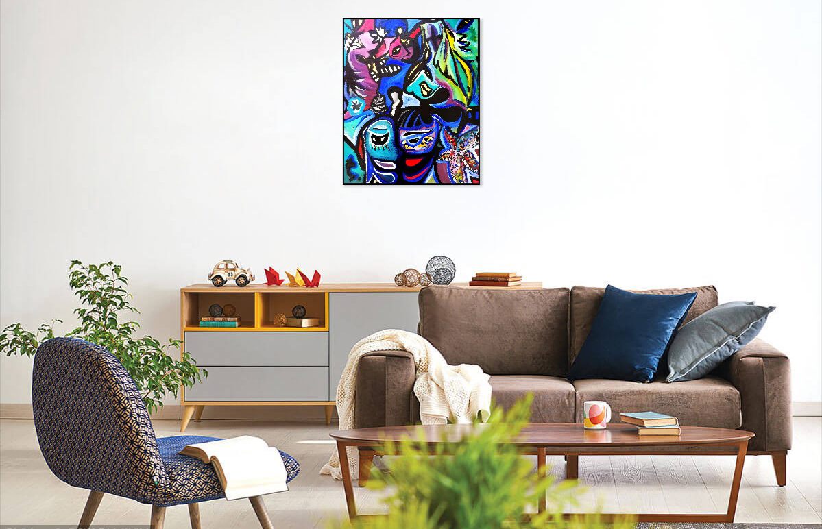 Offrez-vous ce tableau unique réalisé à la peinture acrylique sur un châssis en lin de grande qualité. Les couleurs sont vives et un vernis rend le dessin très brillant.